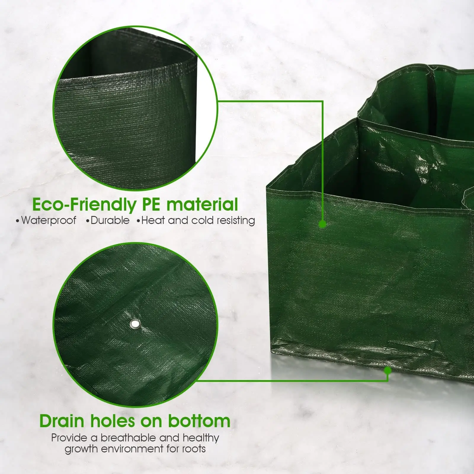 Crafted from durable, non-woven fabric that promotes healthy root growth by allowing optimal air circulation and preventing waterlogging. The UV-resistant and tear-proof material ensures long-lasting use through multiple growing seasons, withstanding harsh weather conditions.
